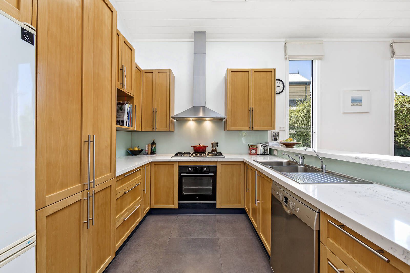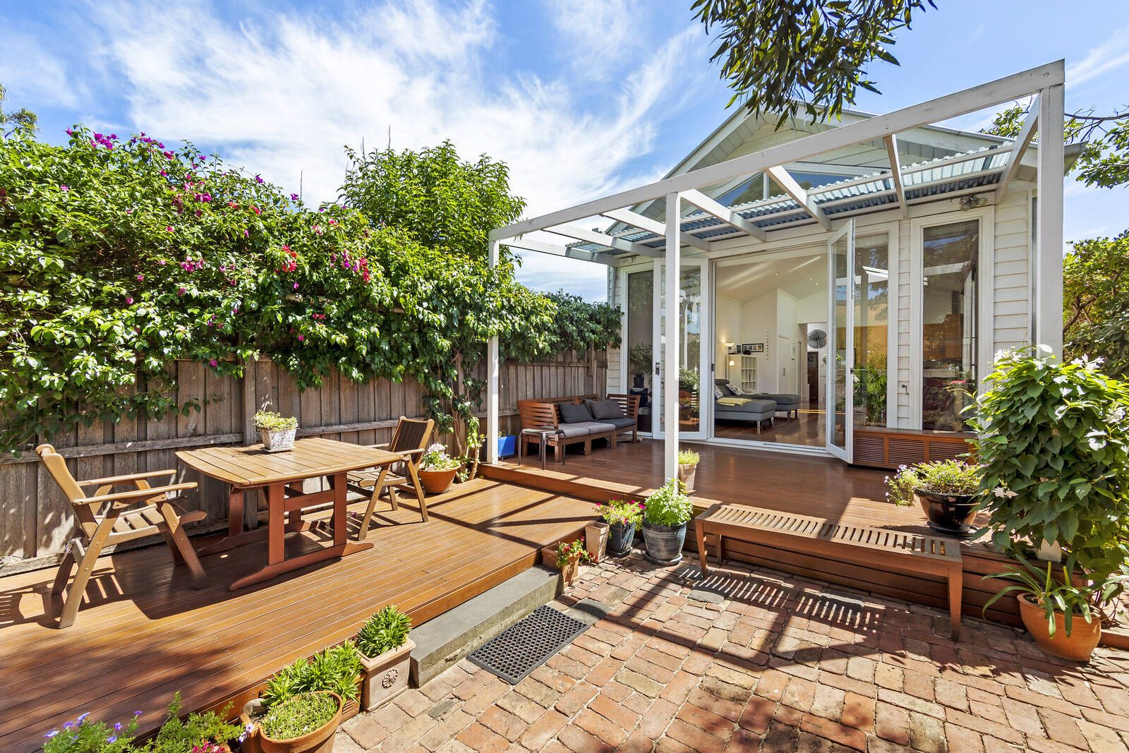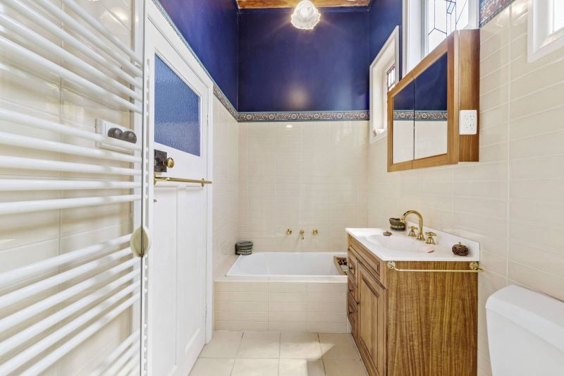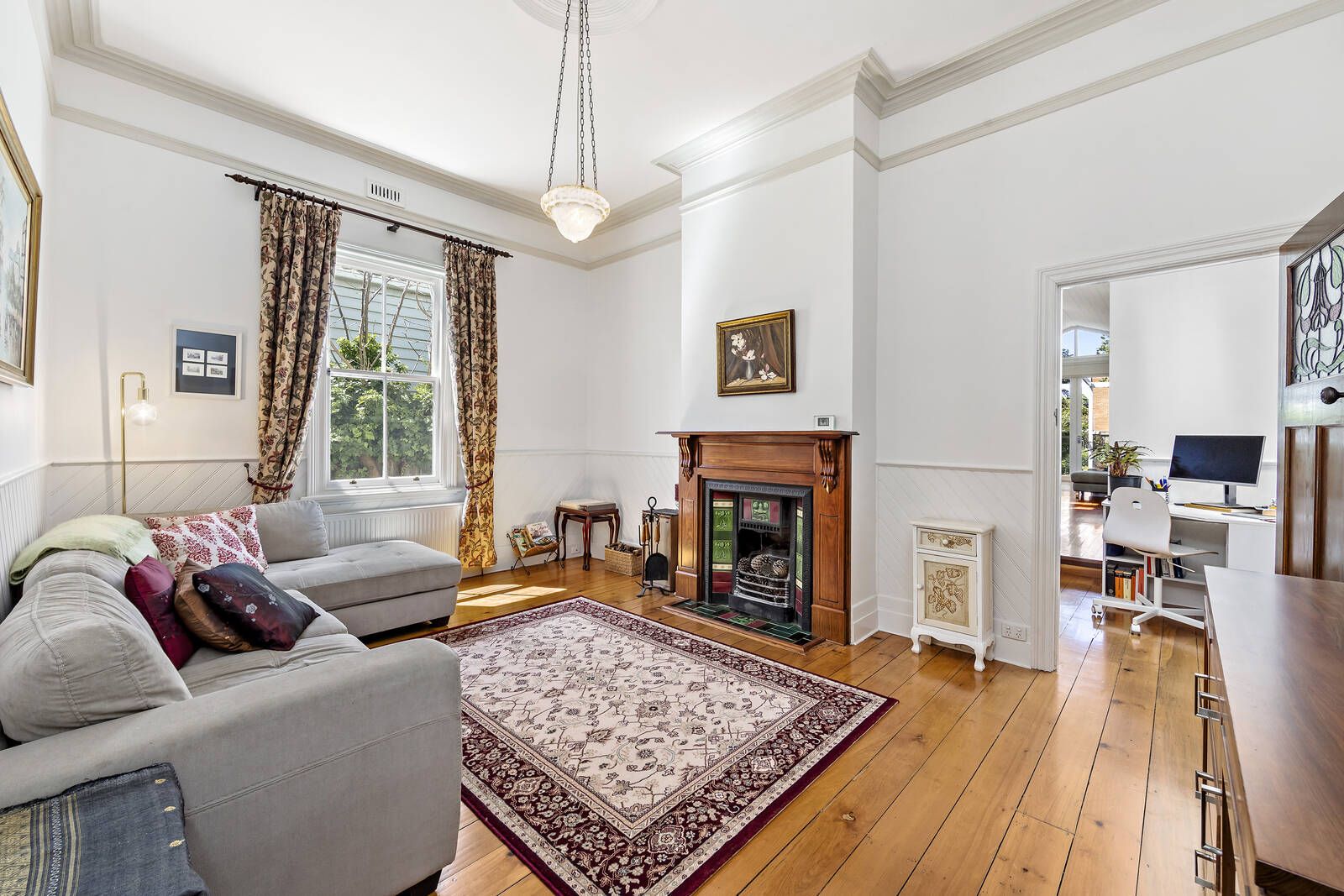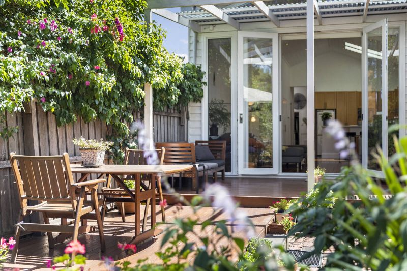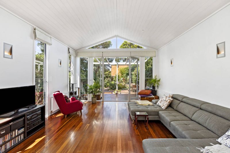 A central formal lounge room (or possible 3rd bedroom) that retains its classical character leads to a contemporary extension, framed by polished floors and soaring ceilings with north facing skylights. An Italian open plan kitchen with stone benches flows to an inviting deck. Hydronic heating throughout, split system cooling and open fireplace. Beyond, the garden delivers its spectacular, surprising spaces.