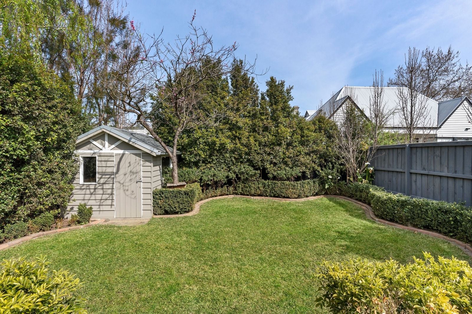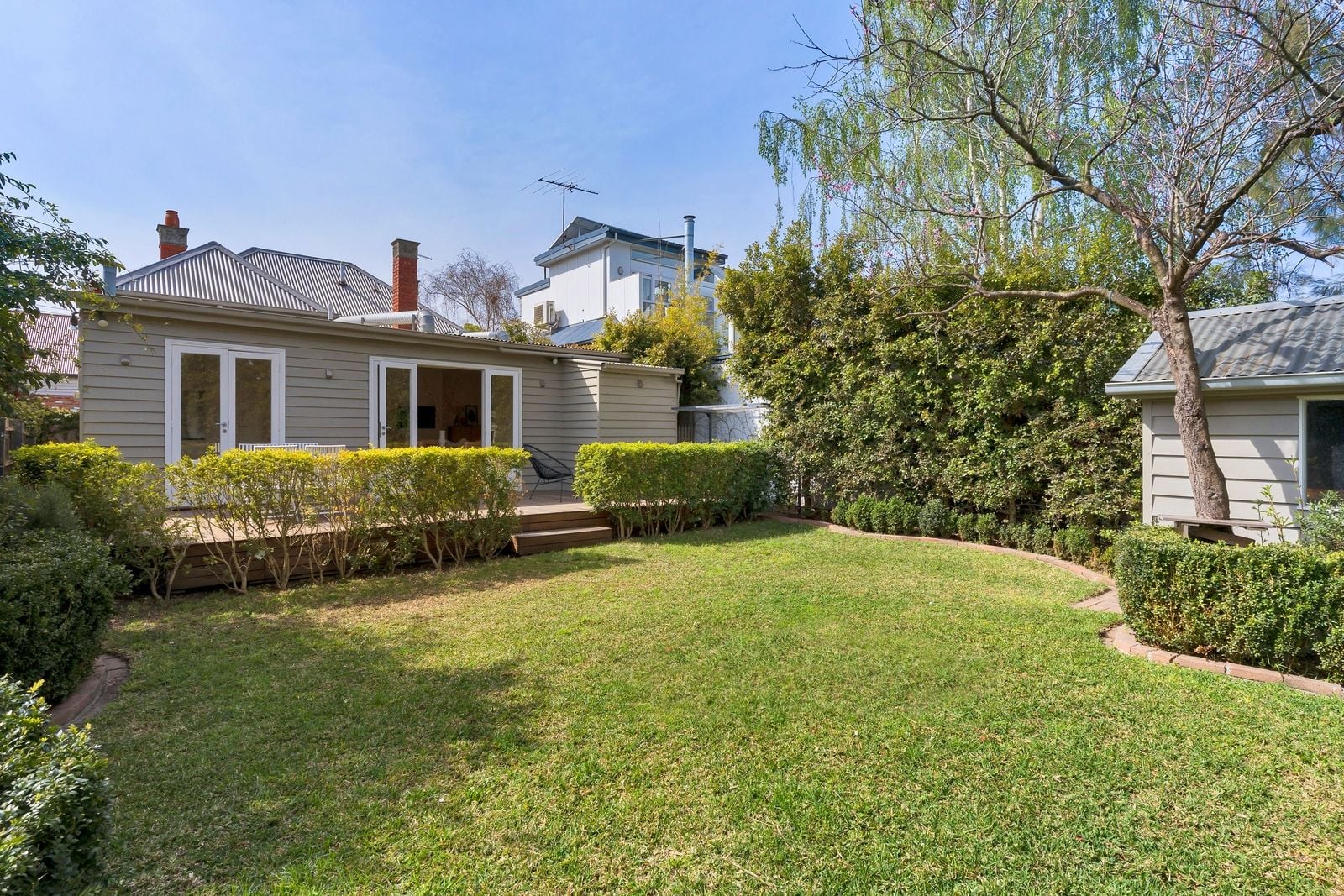 A light-filled extension offers open-plan living, showcasing a full-sized family kitchen and spacious living and dining zones. French doors invite you to step out onto the deck, where you’ll love entertaining family and friends with views of the magnificent back garden. Offering an increasingly rare amount of outdoor space, the garden is fringed by established trees and hedging to create a wonderfully private oasis with lush lawn and a cubbyhouse sure to delight the kids.