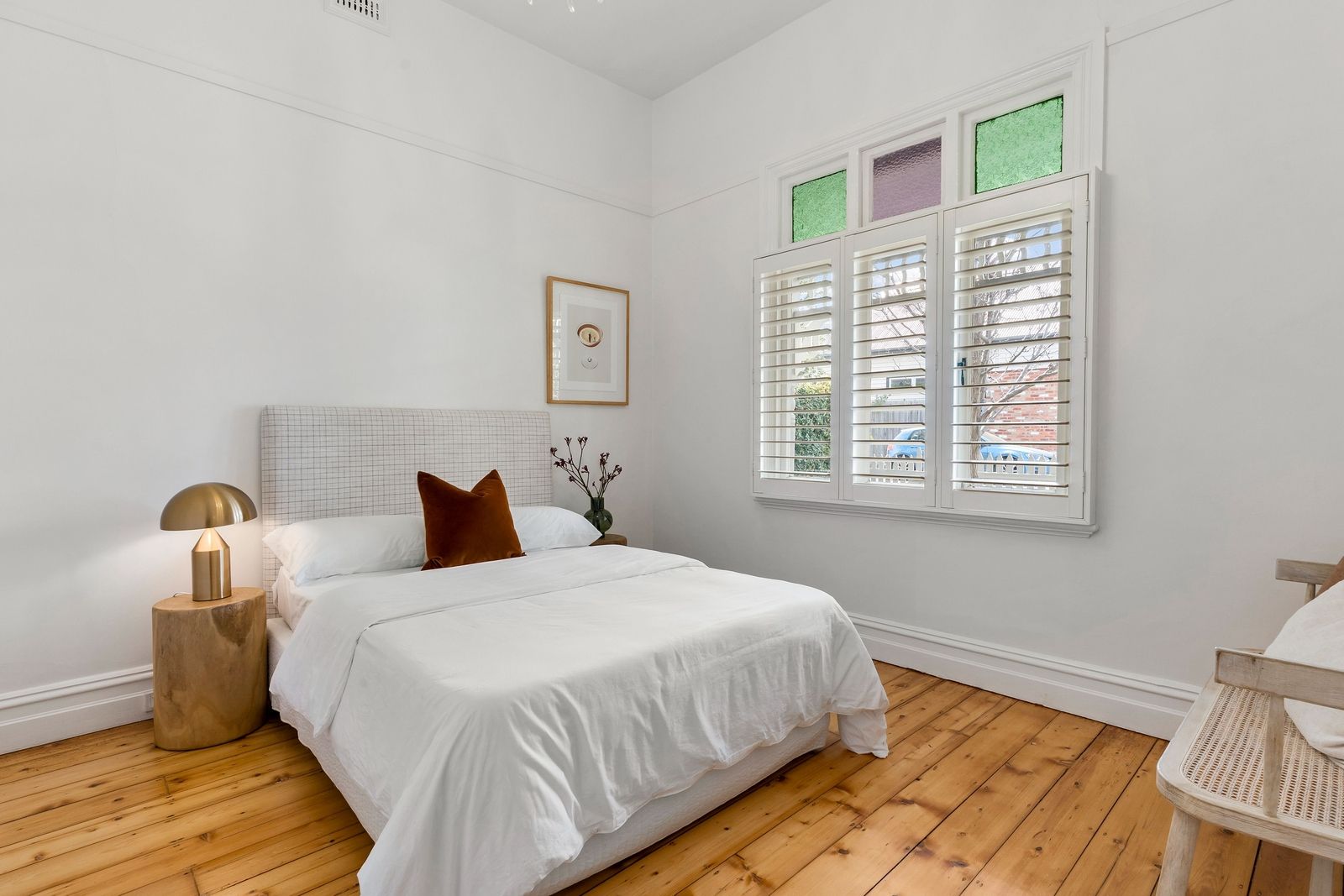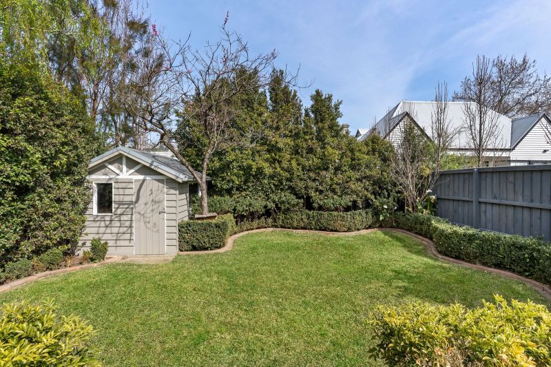 Three bedrooms boast stylish plantation shutters and soaring ceilings, with the large master also featuring a stunning period fireplace. The spacious bathroom with double vanity is ideally positioned for easy access from all of the bedrooms, while the inclusion of a second bathroom with laundry facilities offers enviable convenience for busy families.