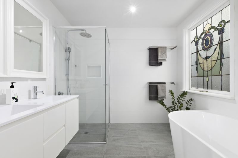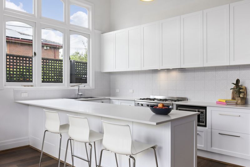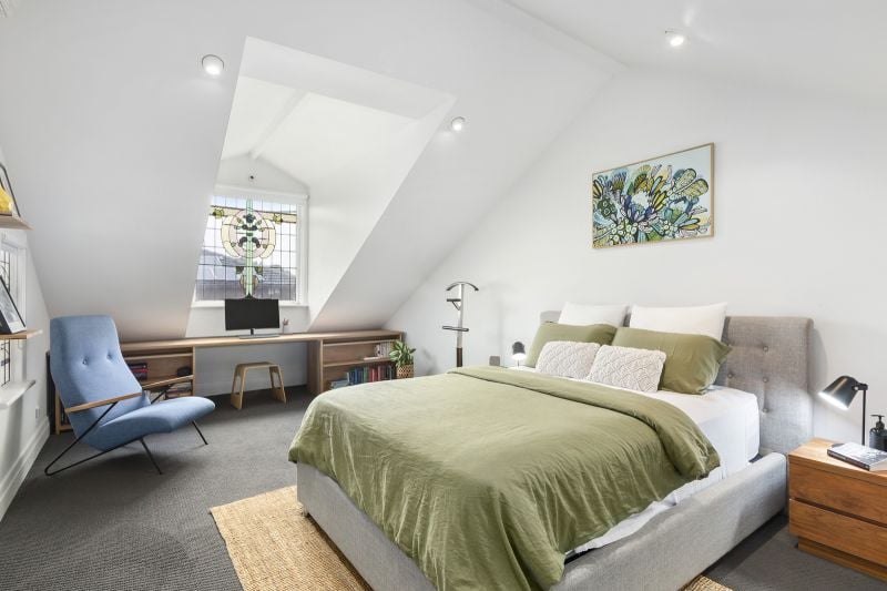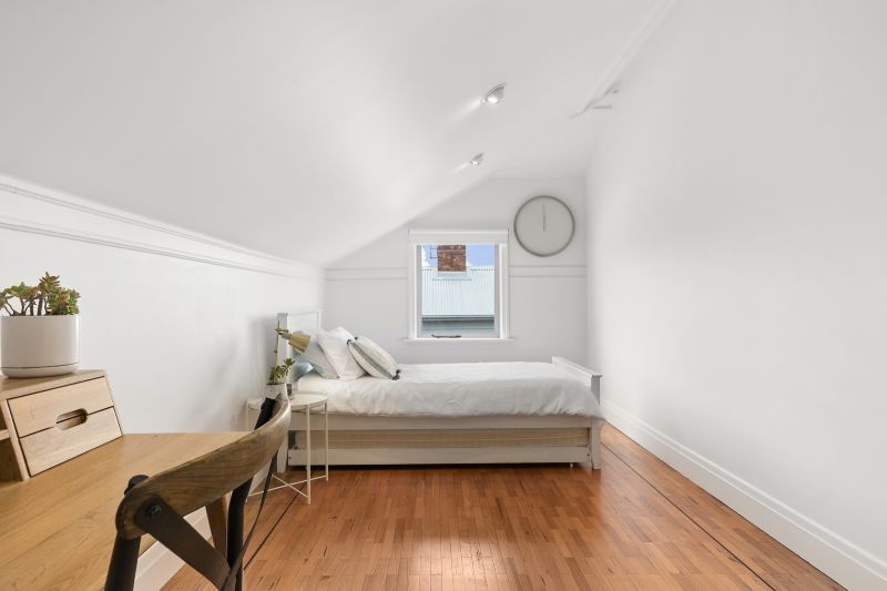 Spend quiet family movie nights in the welcoming living room, with the adjoining kitchen/dining space offering a light-filled family hub sure to become the heart of your home. The all-white kitchen is beautifully appointed with stone benchtops, premium cabinetry and Smeg appliances and overlooks the sunny dining space, where French doors originally used in an English Scottish bank open to the low-maintenance entertainer’s garden. Exposed aggregate paving and realistic artificial turf ensure you’ll never lose your weekends to garden maintenance, while a secure side access roller door invites the possibility of off-street parking.