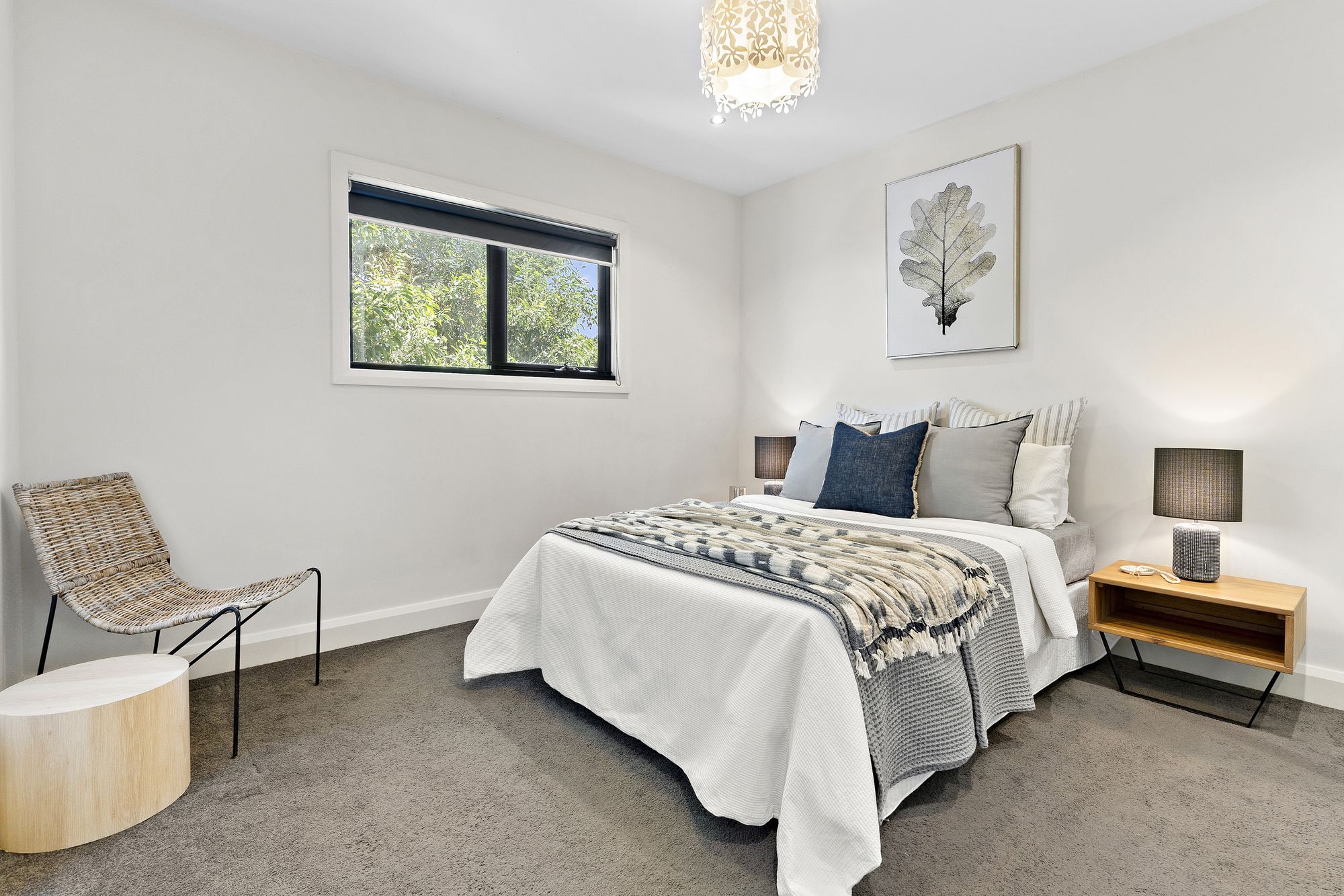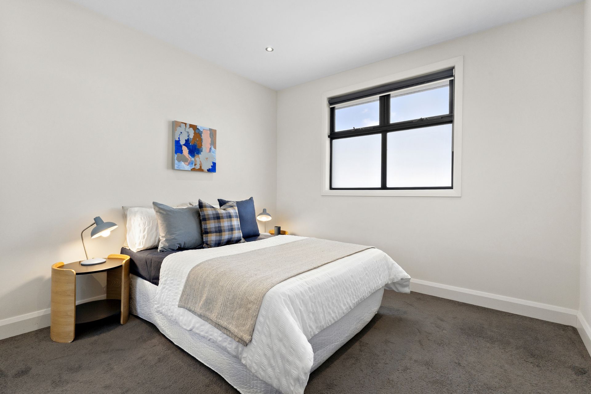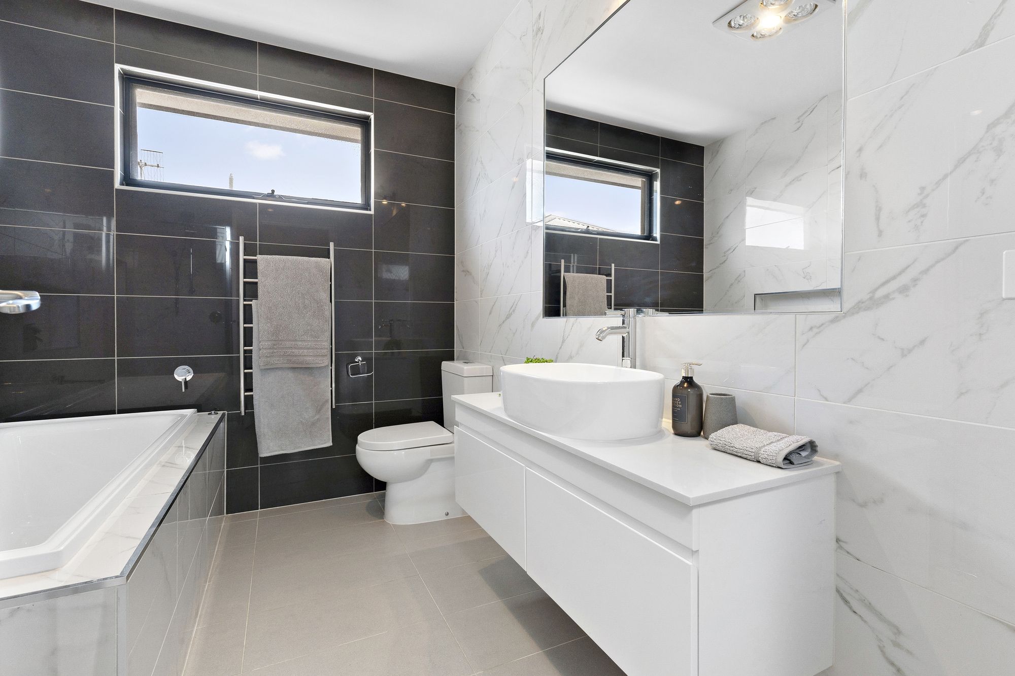 Upstairs, three inviting bedrooms await, including a large master with twin built-in robes and a chic ensuite. The two additional bedrooms boast enviable storage and share the centrally positioned main bathroom, where floor-to-ceiling tiling sets the scene for everyday luxury.