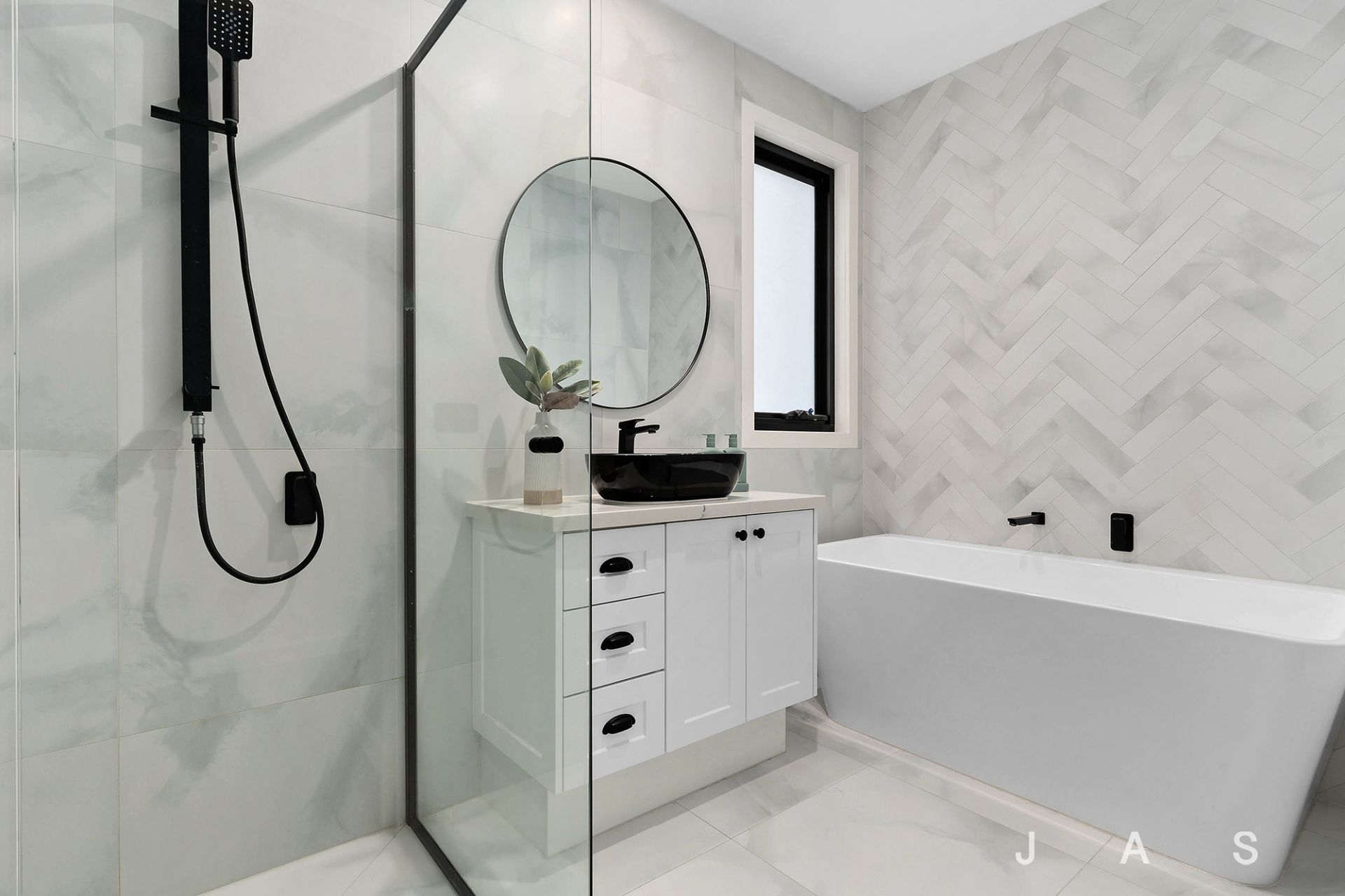 Three bedrooms offer inviting retreats, with a large master boasting a walk-in robe and an inviting ensuite joined by two additional bedrooms including one with a large built-in robe and one with a walk-in robe. Two family bathrooms add extra appeal and include a stunning, fully tiled main bathroom with a luxe bathtub.