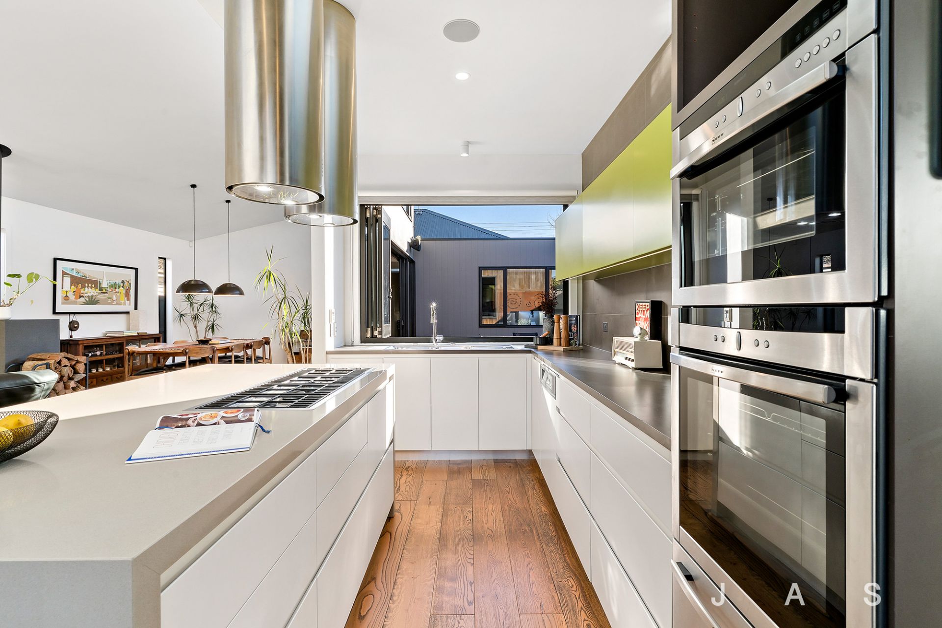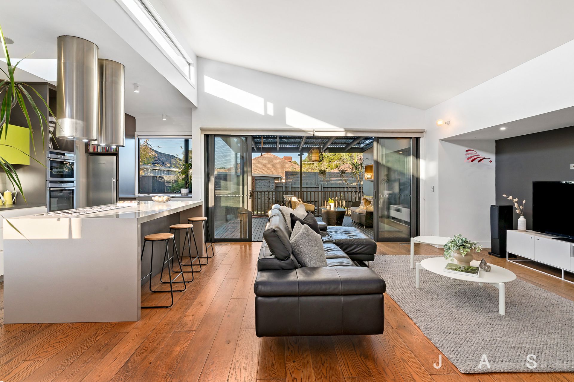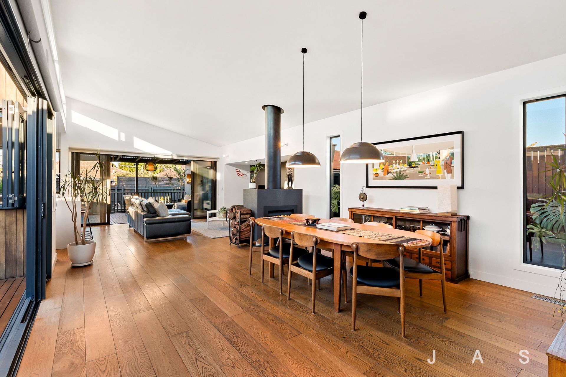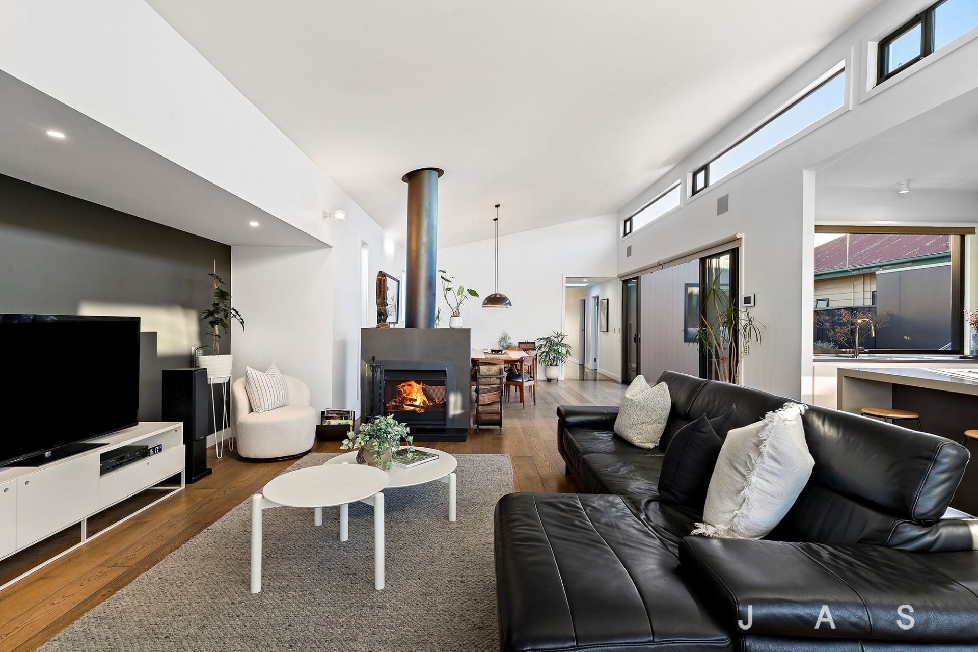 • Spacious rear open-plan living area with statement engineered American Oak floors, a soaring raked ceiling, and operable clerestory windows that capture the winter sun and release the summer heat