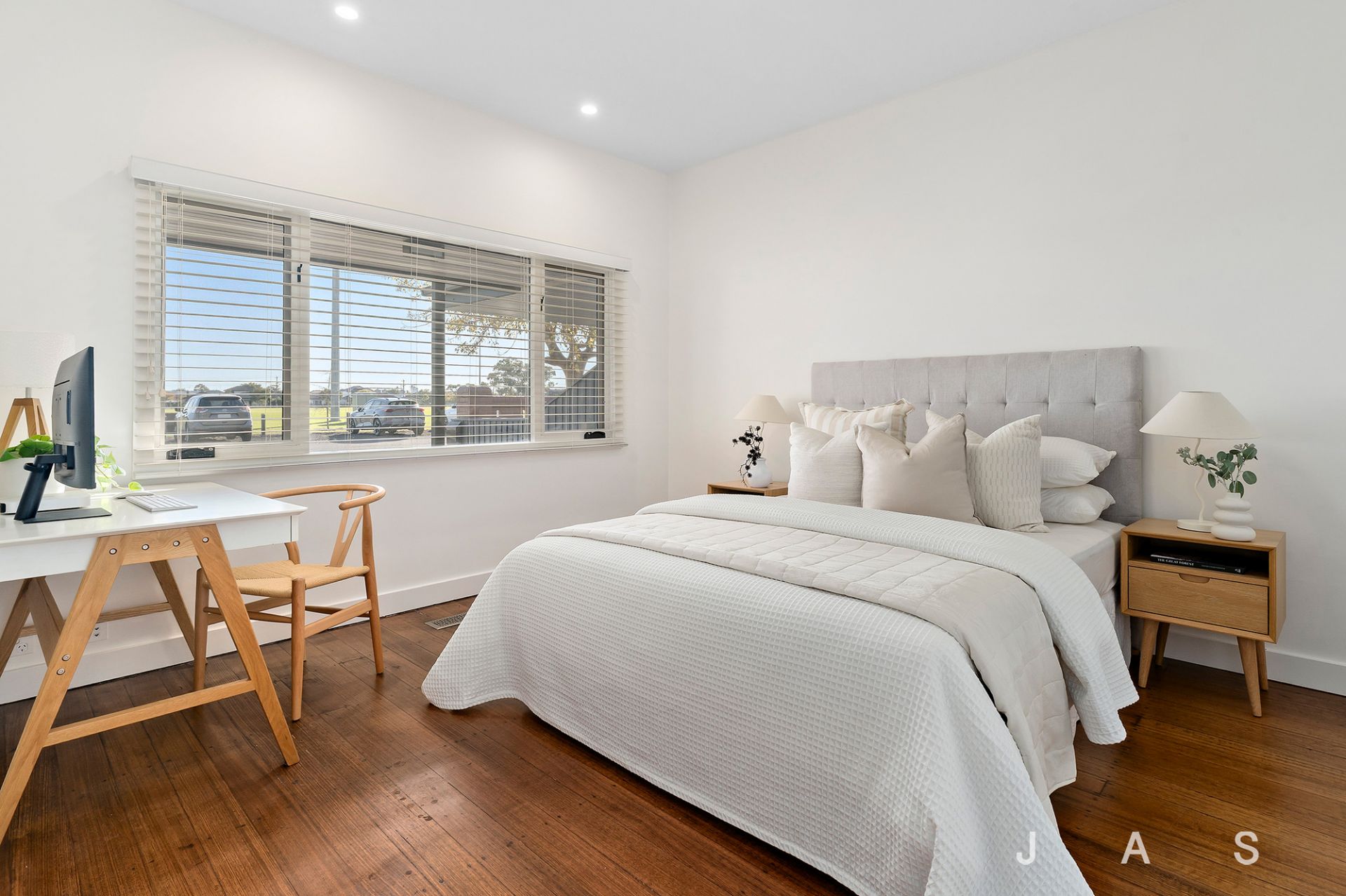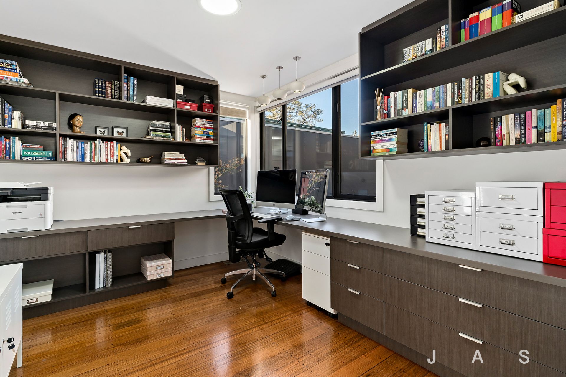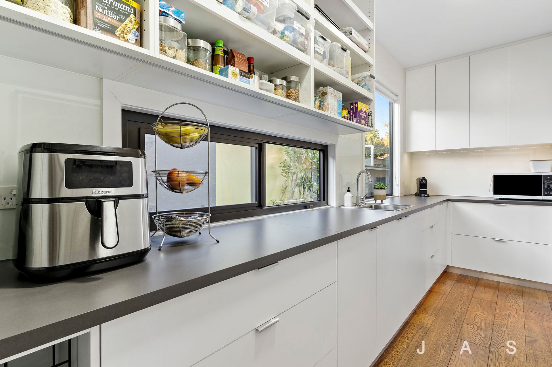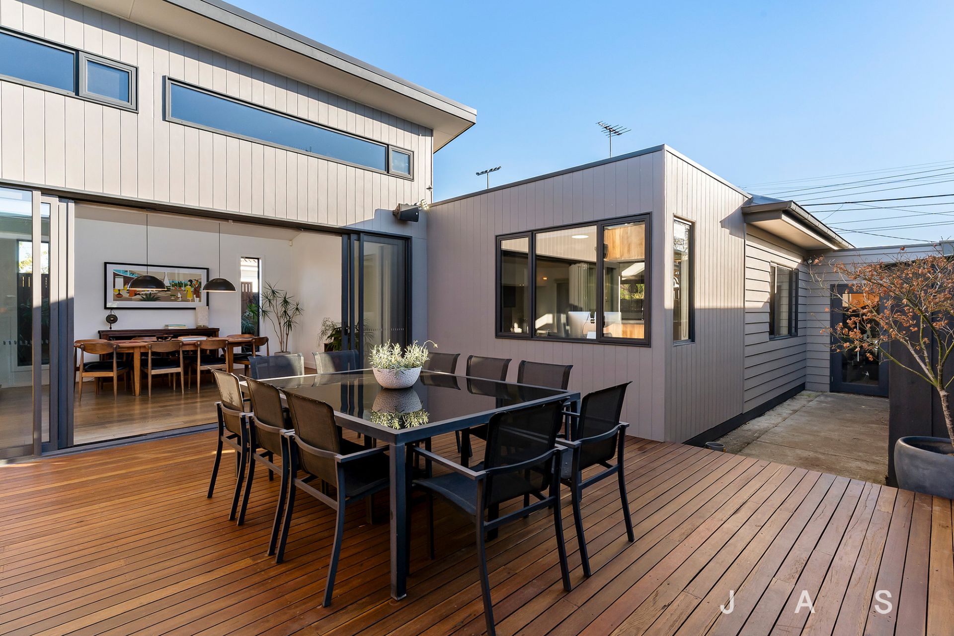 • Spacious rear open-plan living area with statement engineered American Oak floors, a soaring raked ceiling, and operable clerestory windows that capture the winter sun and release the summer heat