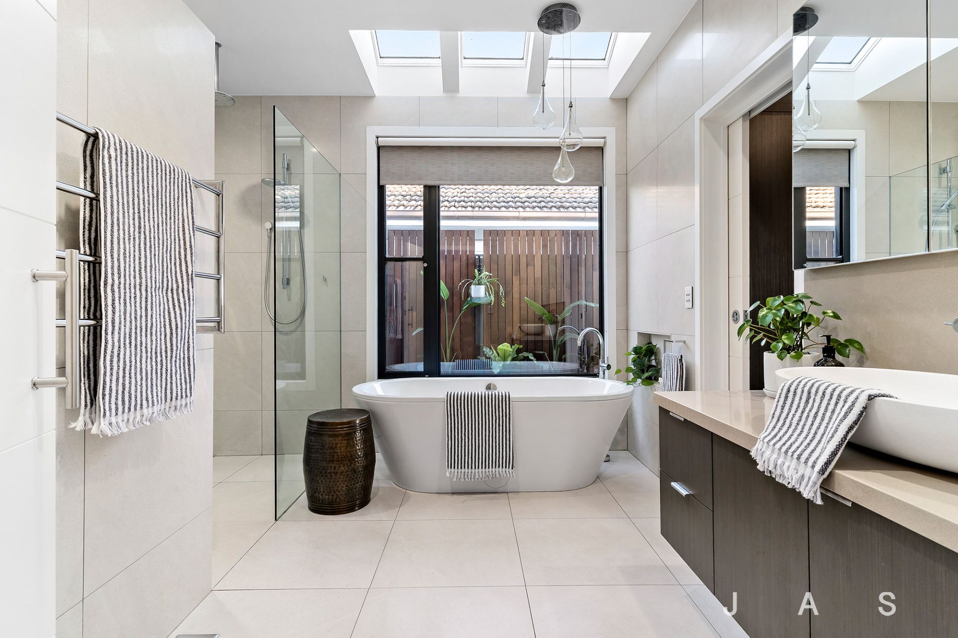 The master bedroom and second bedroom have views across the reserve. The luxurious family bathroom is a skylit sanctuary with a freestanding bathtub and a roomy walk-in shower. The bathroom features large-format natural stone porcelain tiles from floor to ceiling.