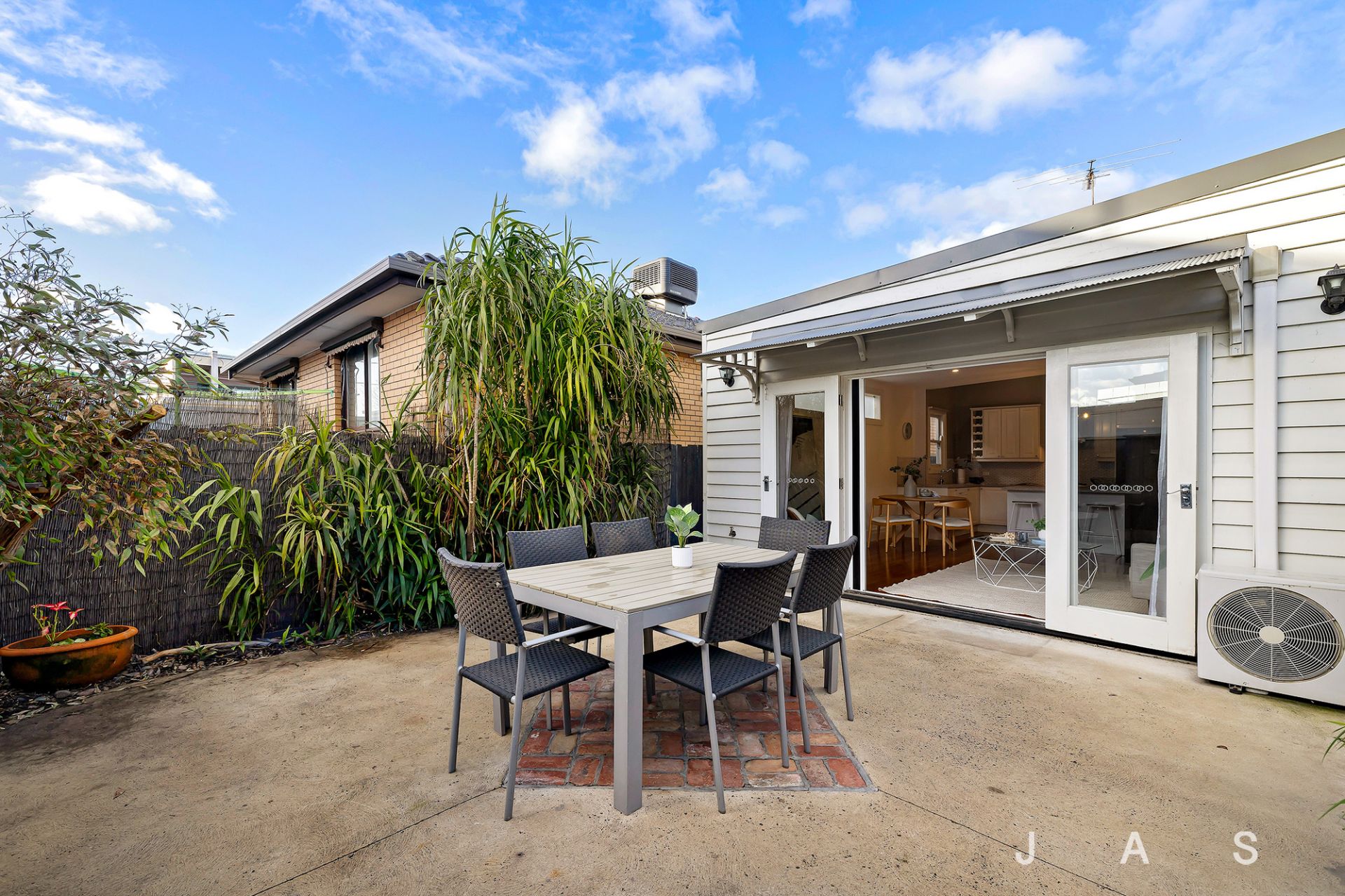 Double doors invite you to dine and entertain alfresco in the paved courtyard, ready for summer BBQs, morning coffee in the sun and outdoor play for kids and pets.