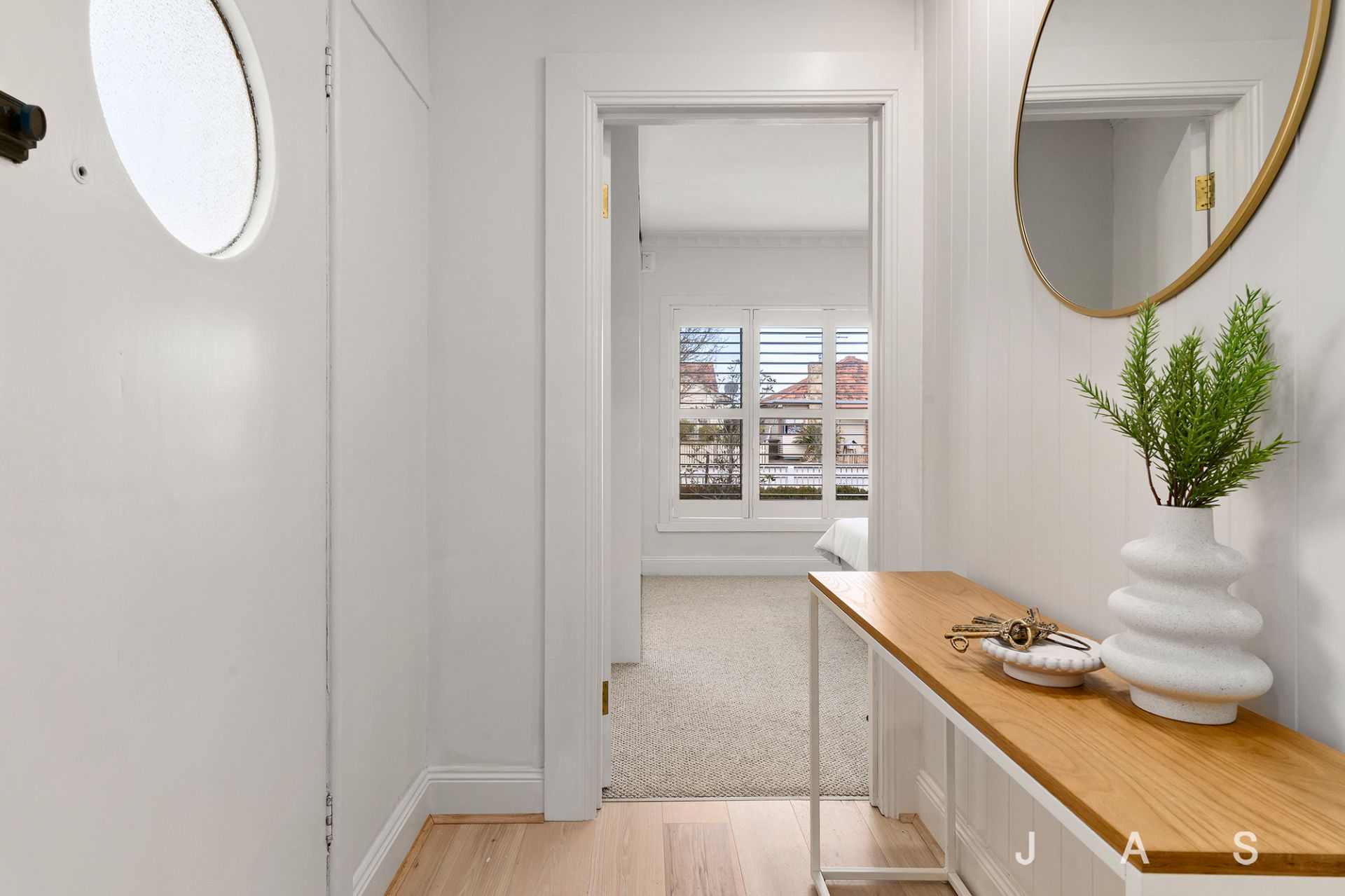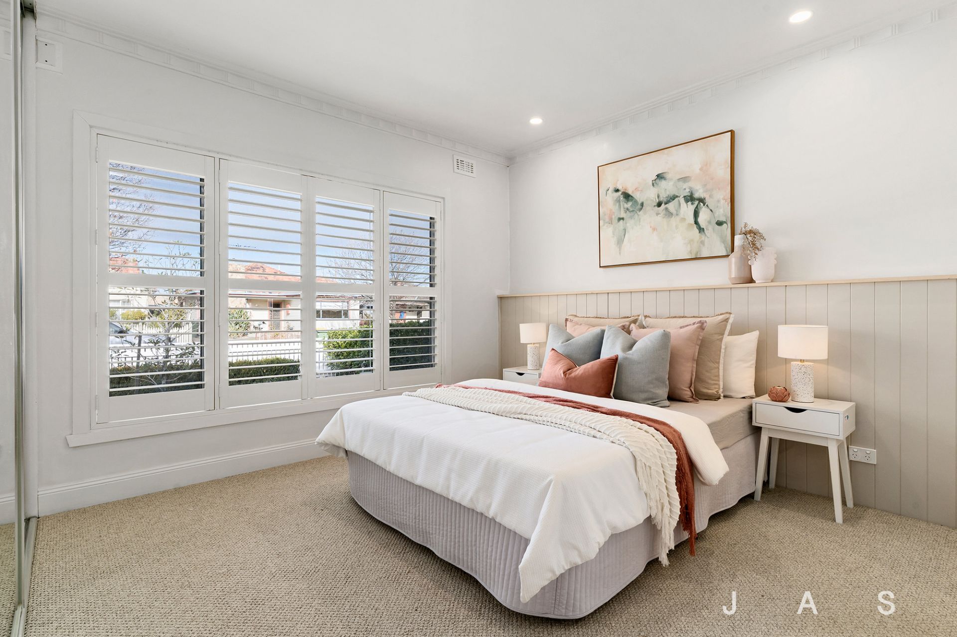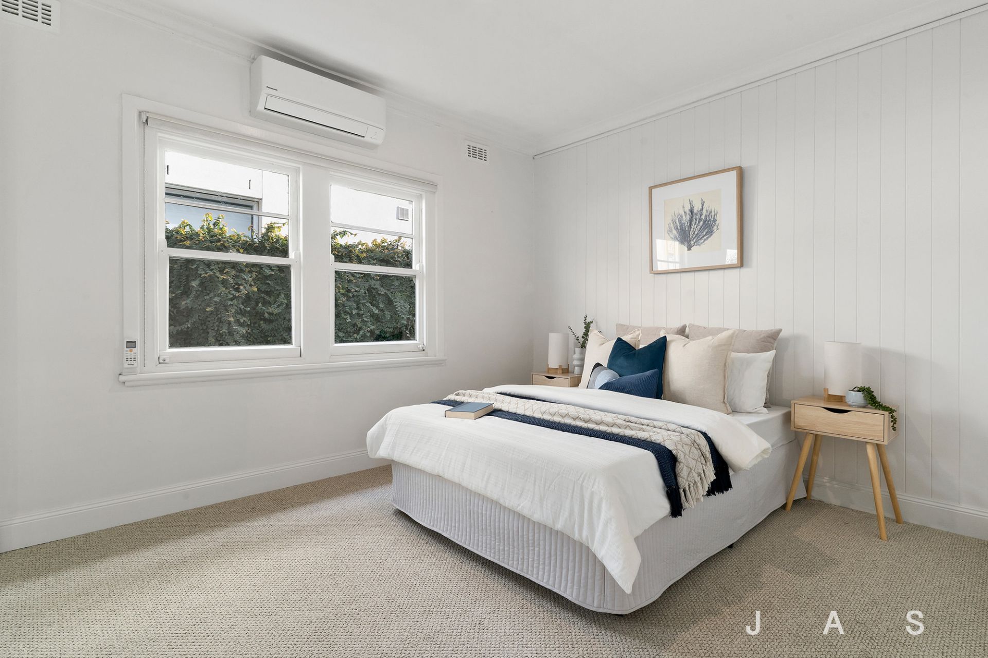 Two bedrooms with built-in robes offer inviting retreats, with the generous master boasting a beautifully styled ensuite, with feature tiling, a walk-in rainfall shower, a stone-topped timber vanity and chic brass tapware. The second bedroom is served by the main bathroom, styled to match the ensuite and offering the luxury of a deep bathtub and the convenience of incorporated laundry facilities.