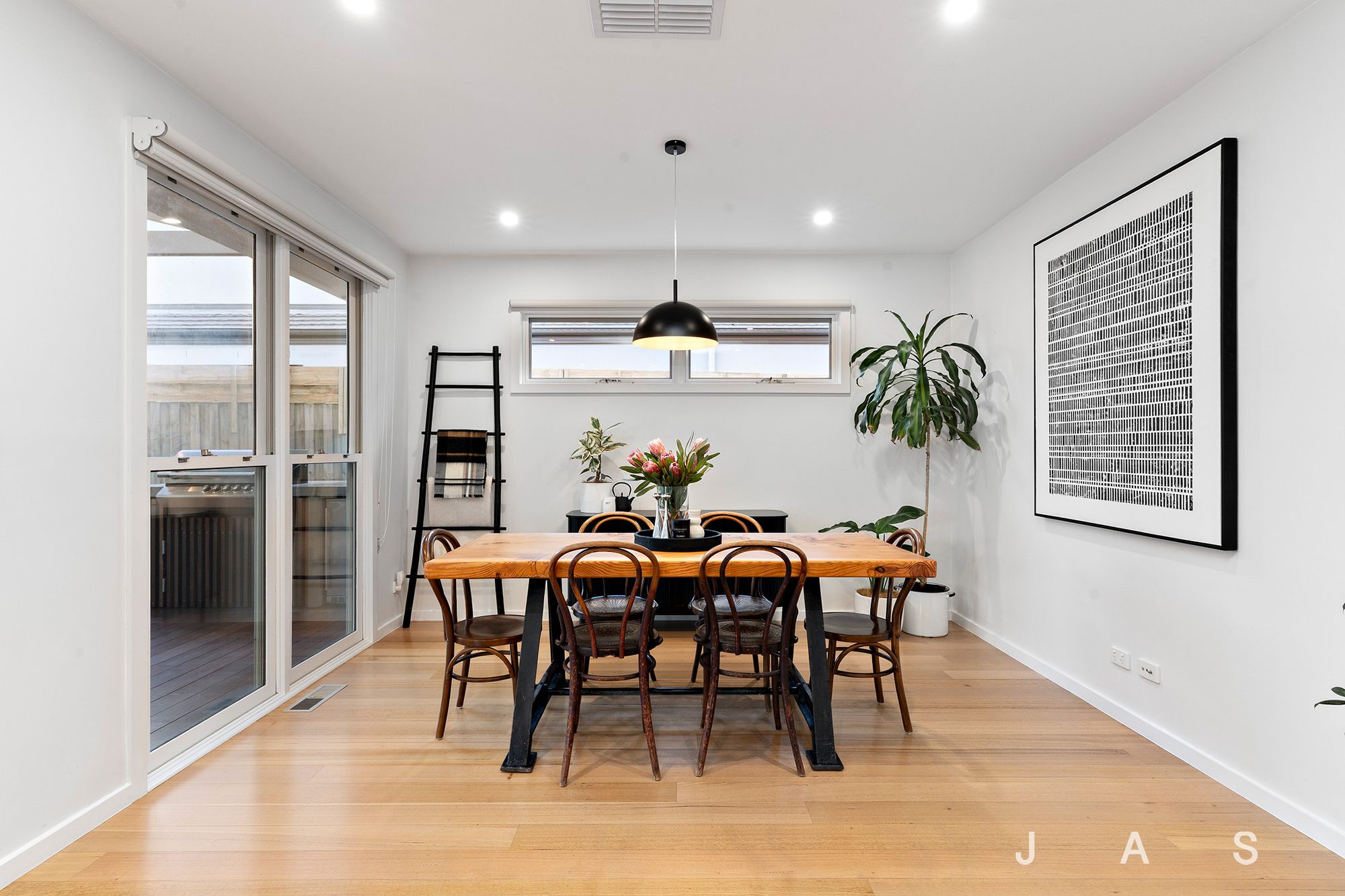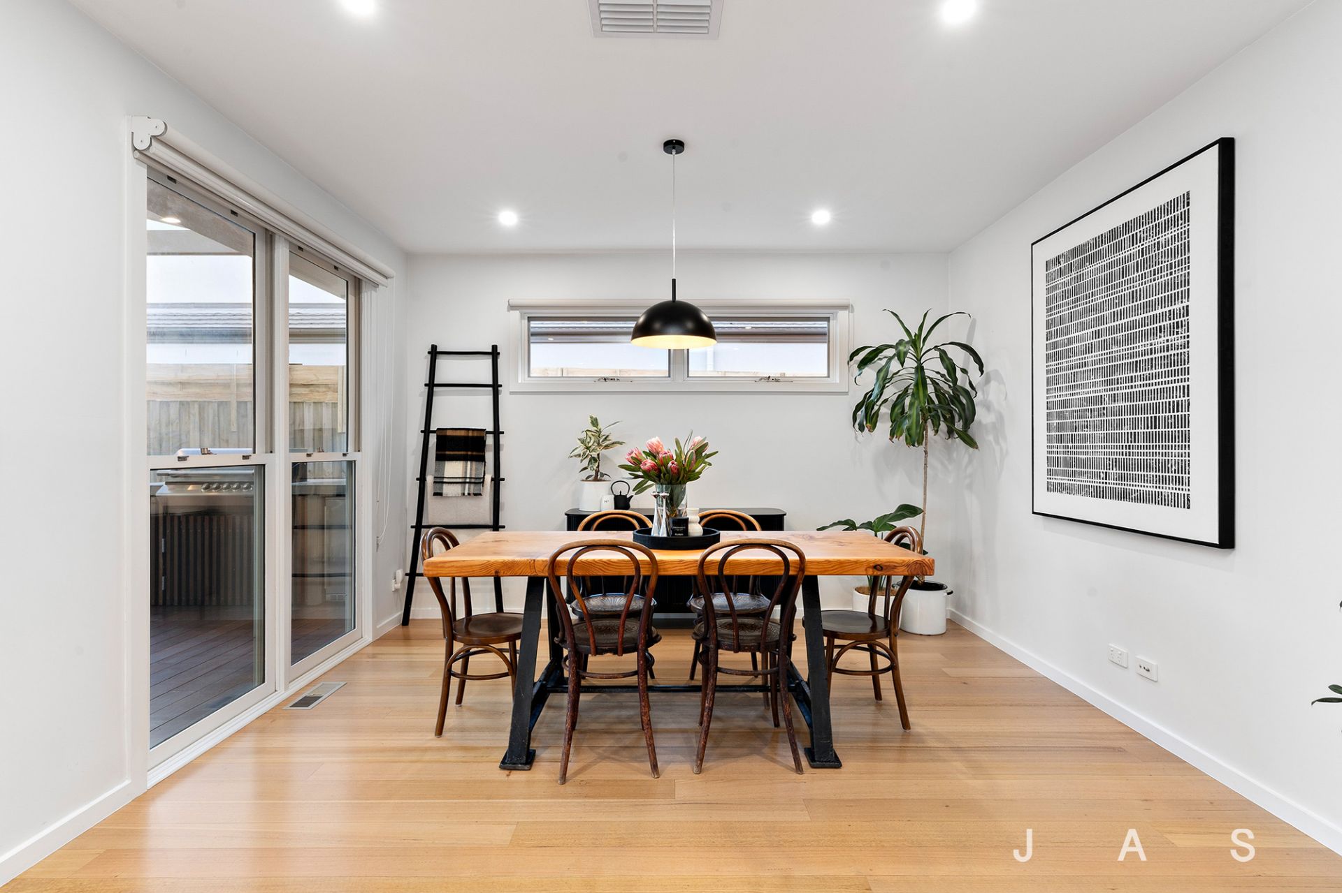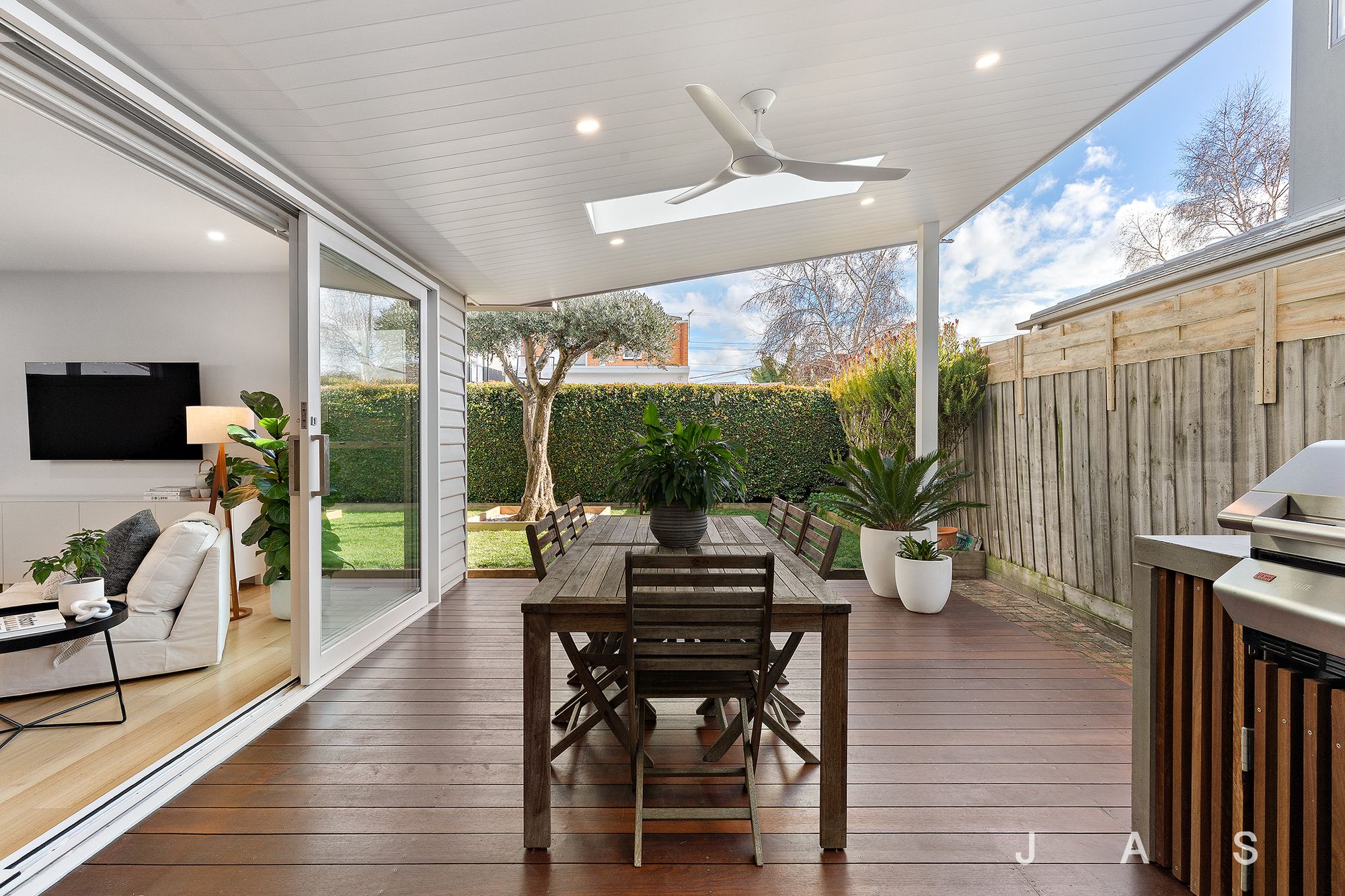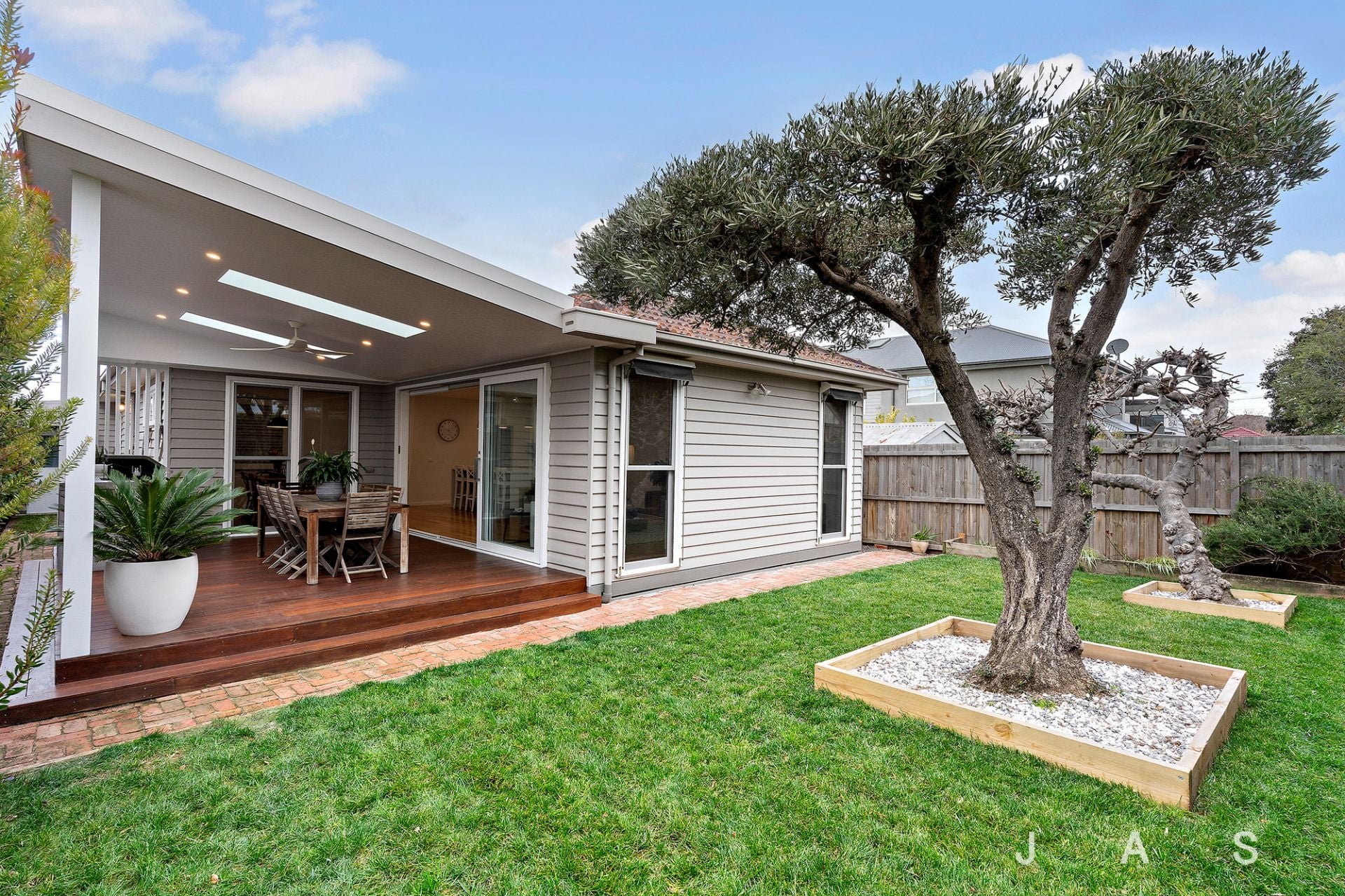 Generous timber, double-glazed sliding doors extend the space to the expansive north-facing covered deck with a built-in BBQ area, further enhanced by two large skylights. The generous back garden beyond offers loads of space for the kids to run and play in the shade of seventy-year-old fig and olive trees.