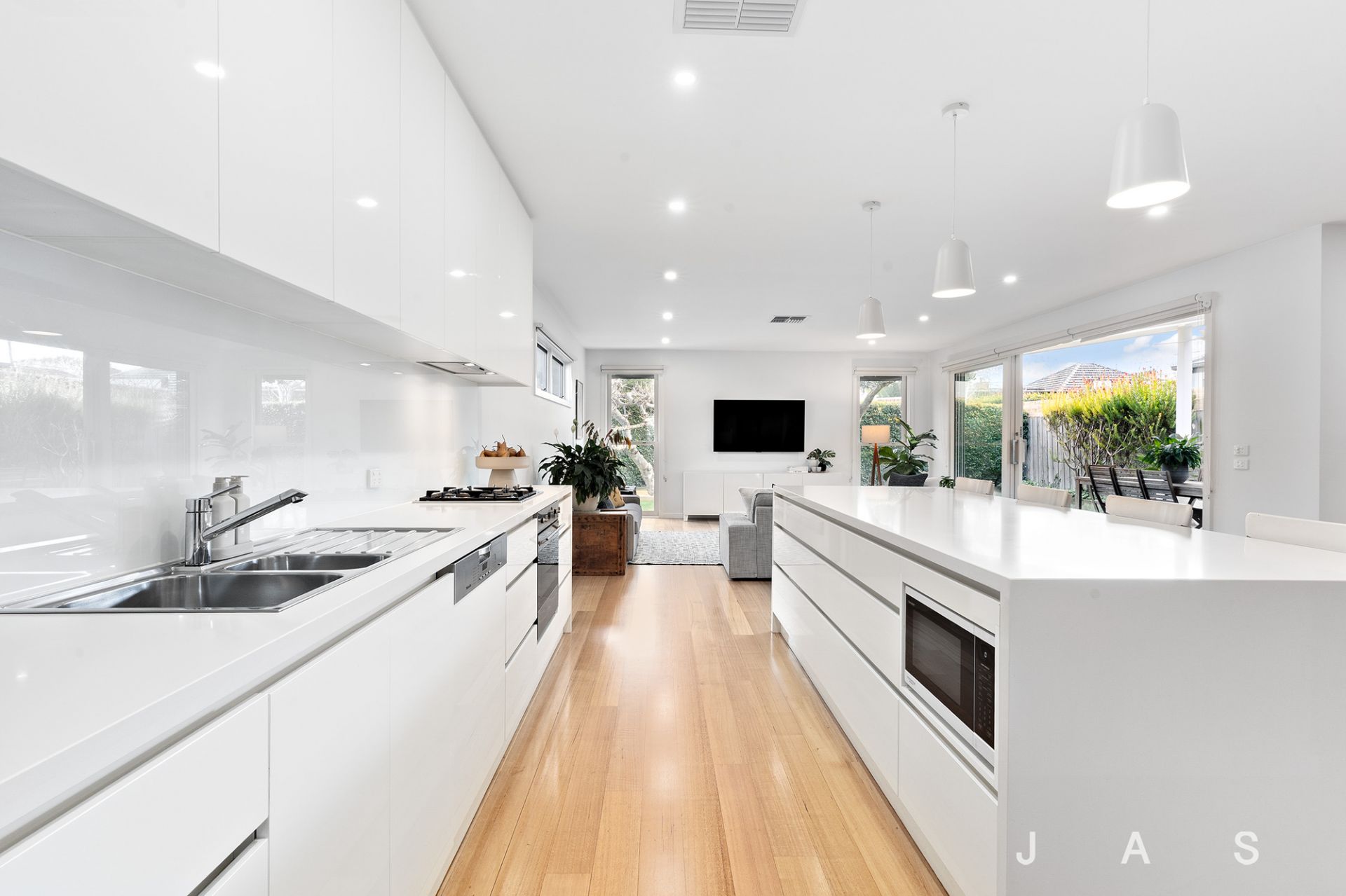 Sun-drenched open-plan living offers a superb hub for relaxing and entertaining, with generous lounge and dining zones joined by a beautifully appointed stone-topped kitchen boasting a walk-in pantry, sleek cabinetry, a pendant-lit island bench with breakfast bar and quality Smeg appliances, including a Miele semi-integrated dishwasher.