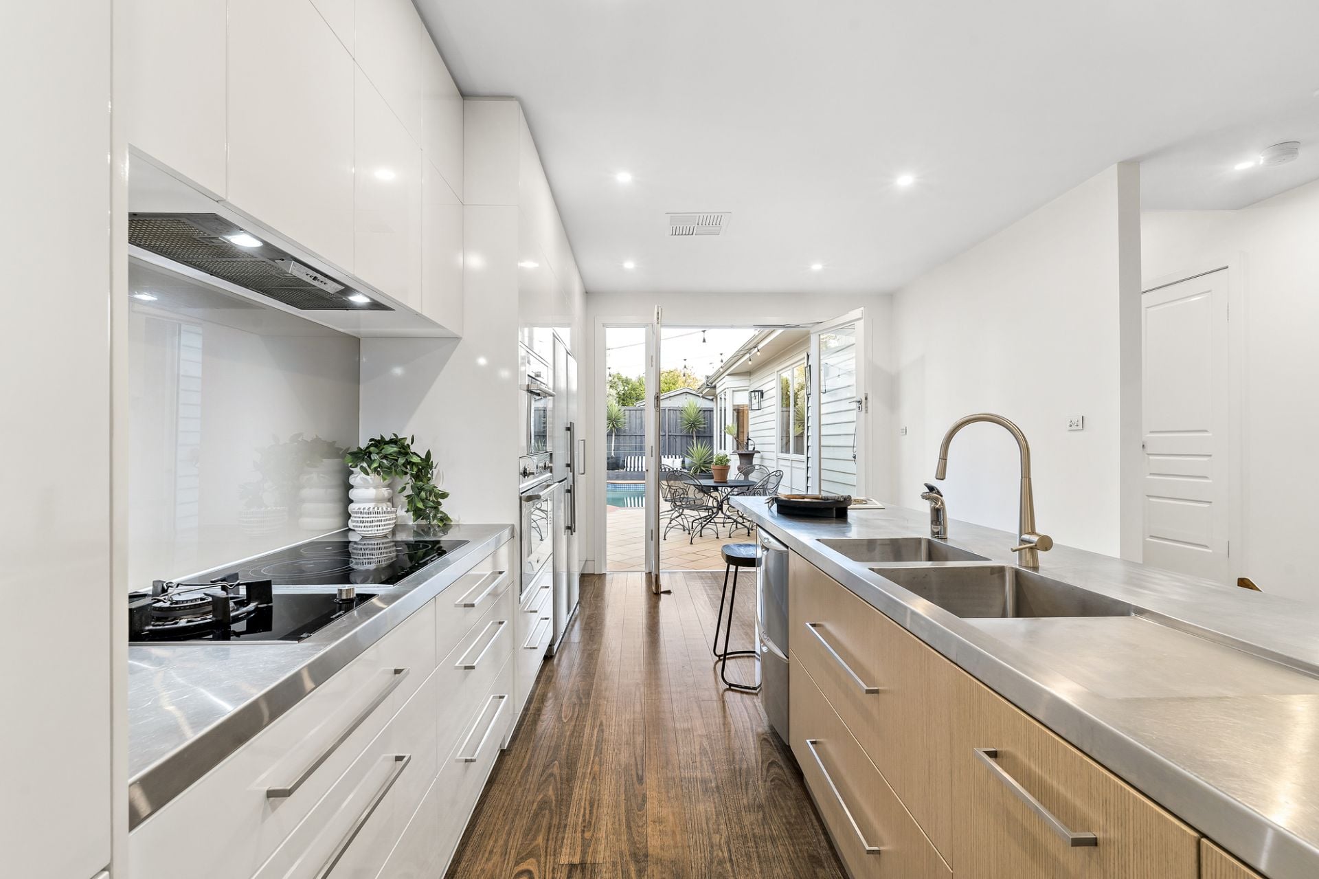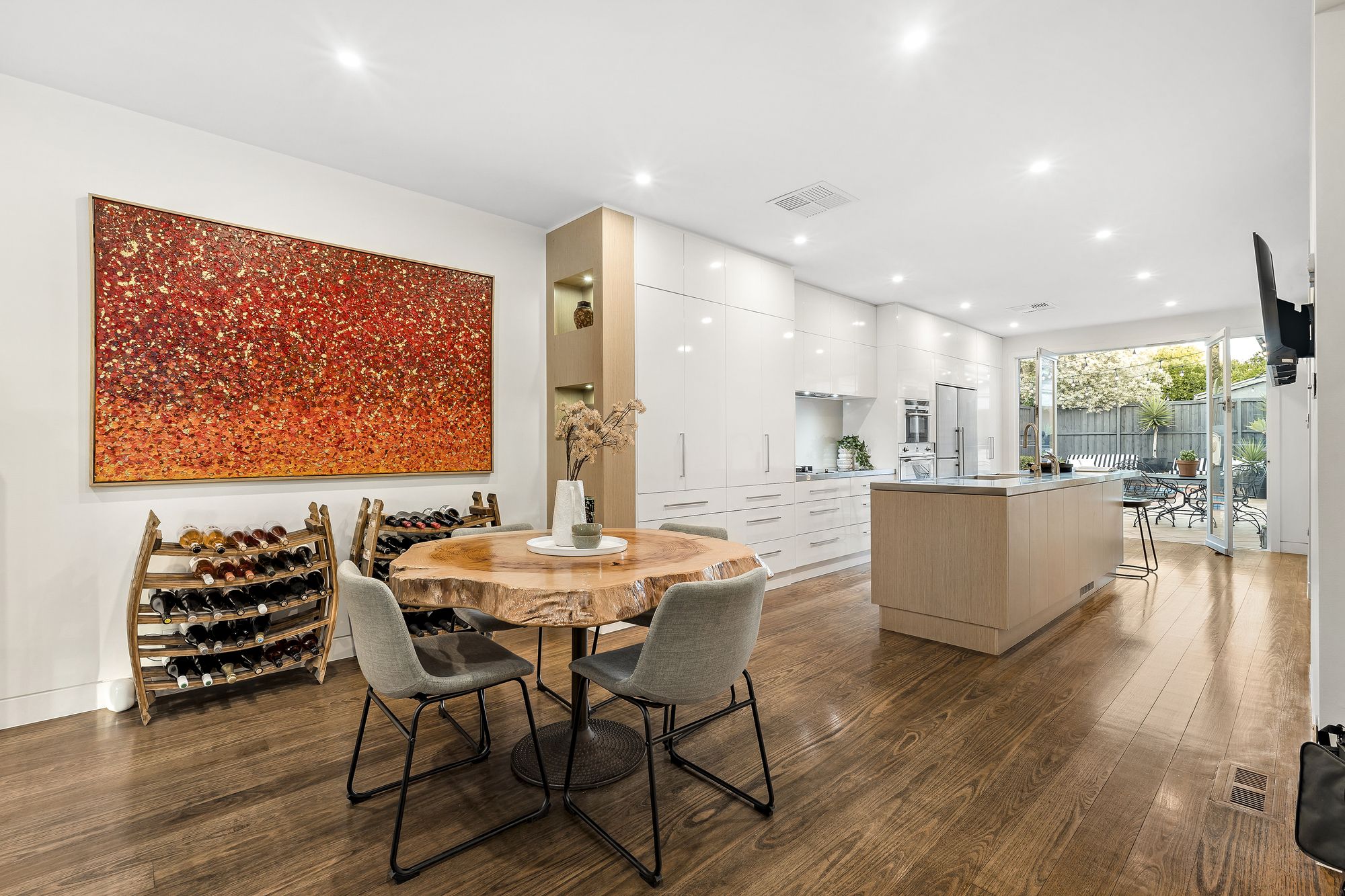 • Expansive, light-filled open-plan living and dining anchored by a well-appointed kitchen featuring Siemens, Fisher & Paykel appliances, and sleek stainless steel benches.