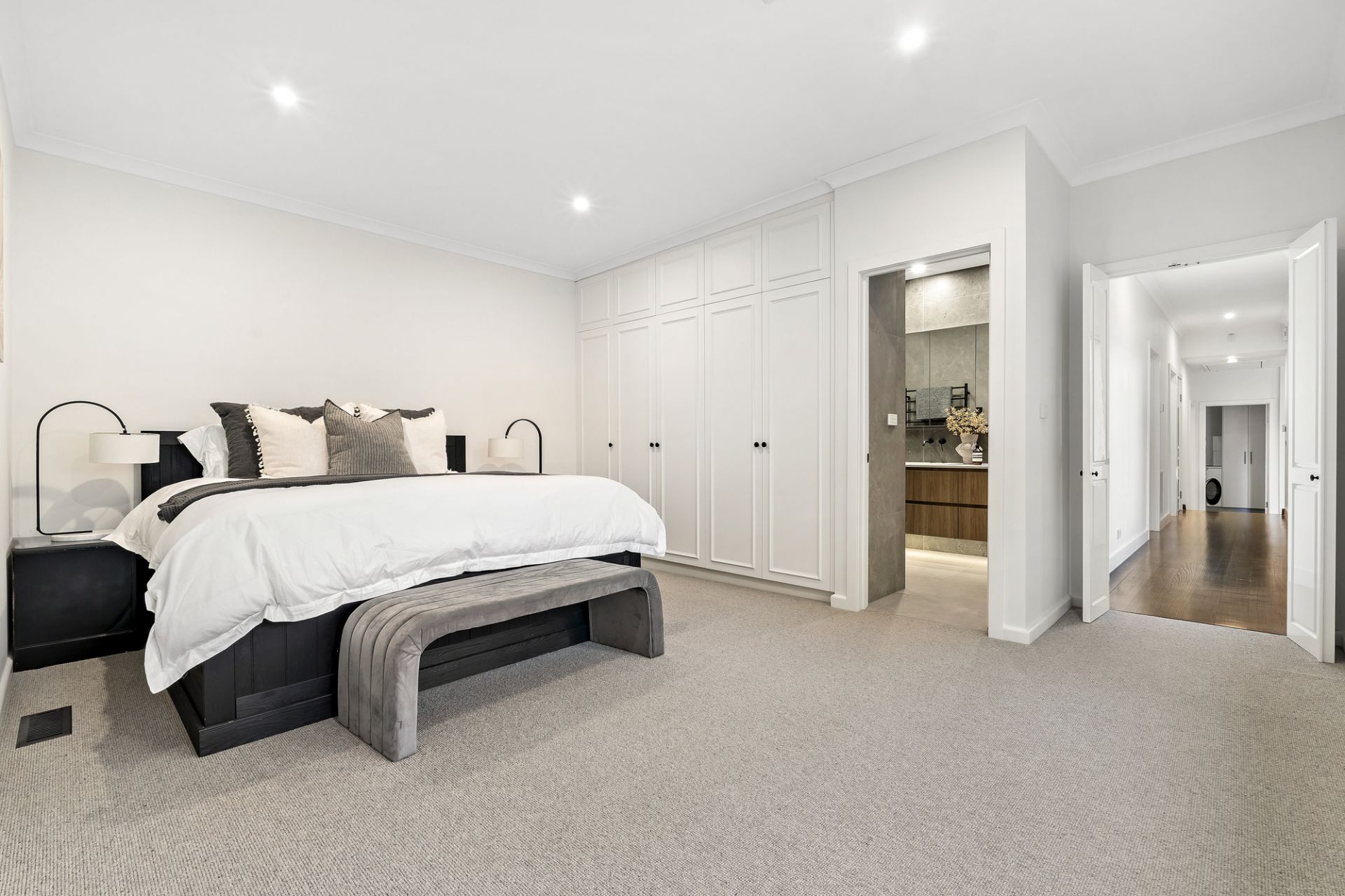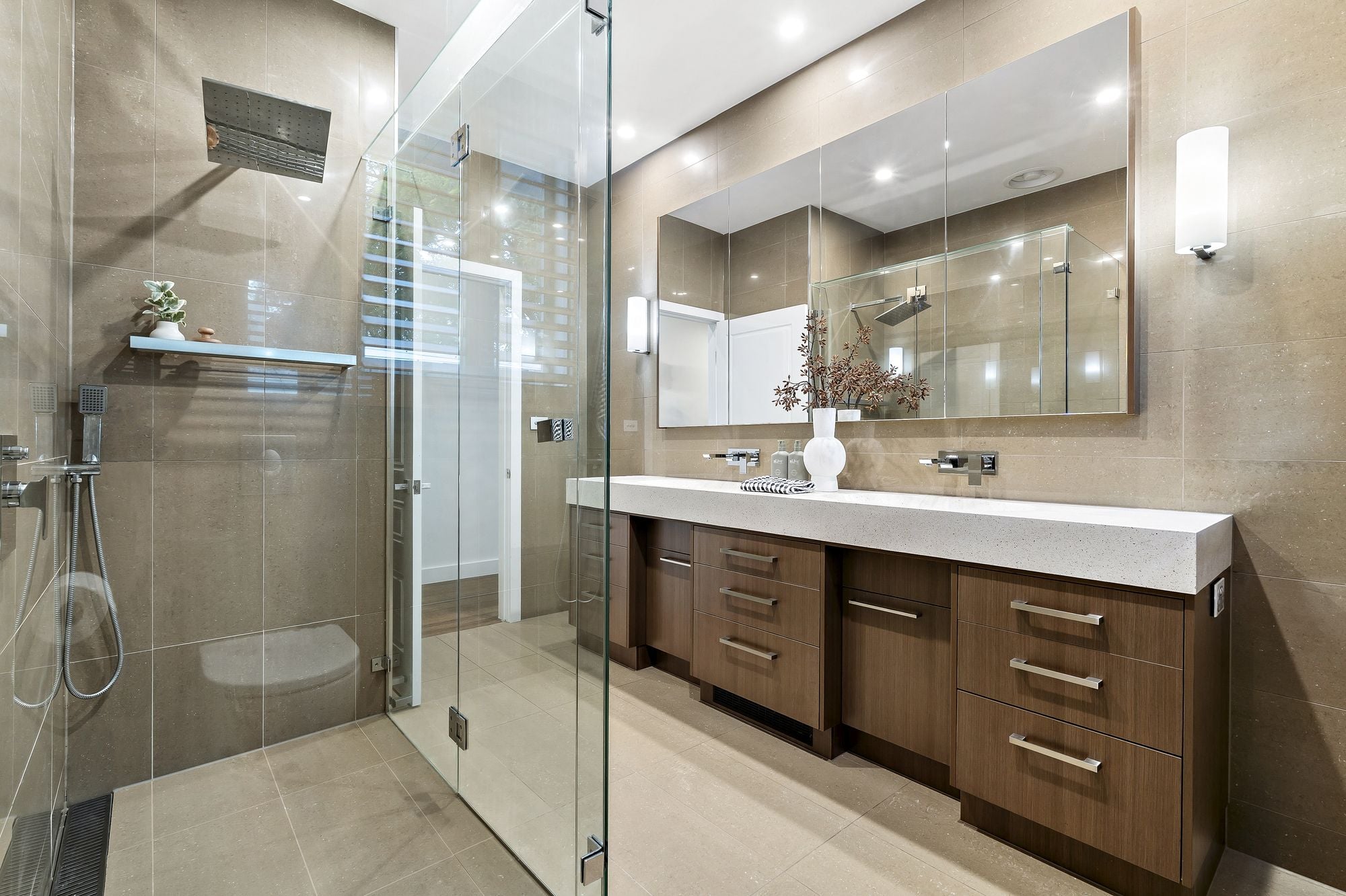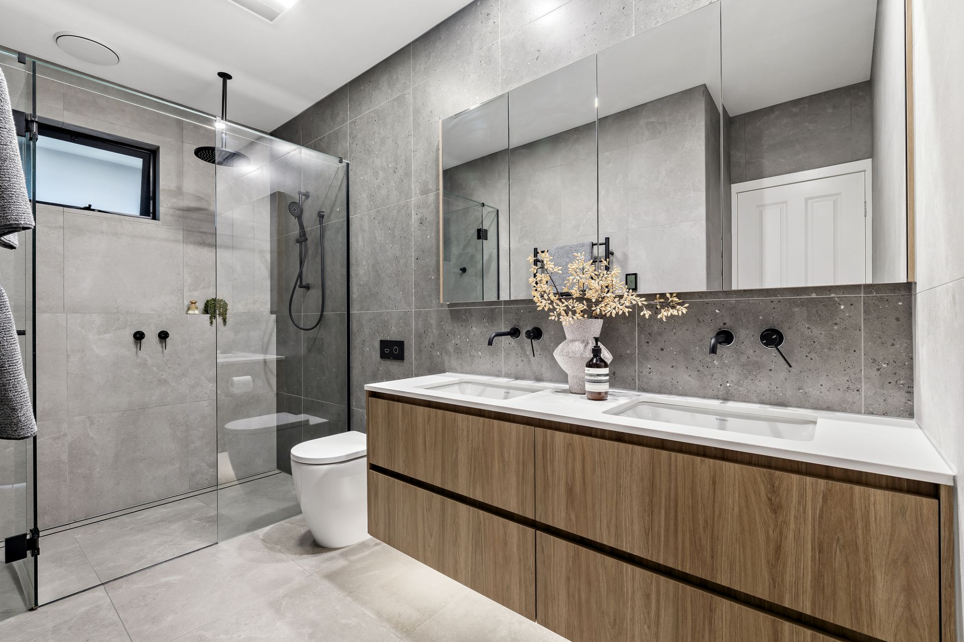 • Massive five-star main bathroom with double vanity and floor-to-ceiling tiling.