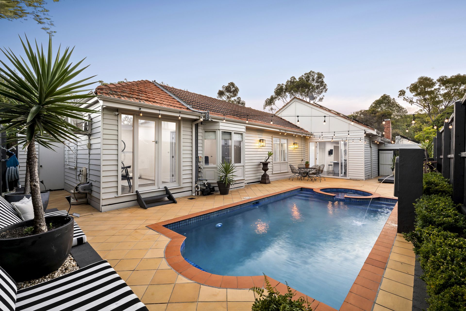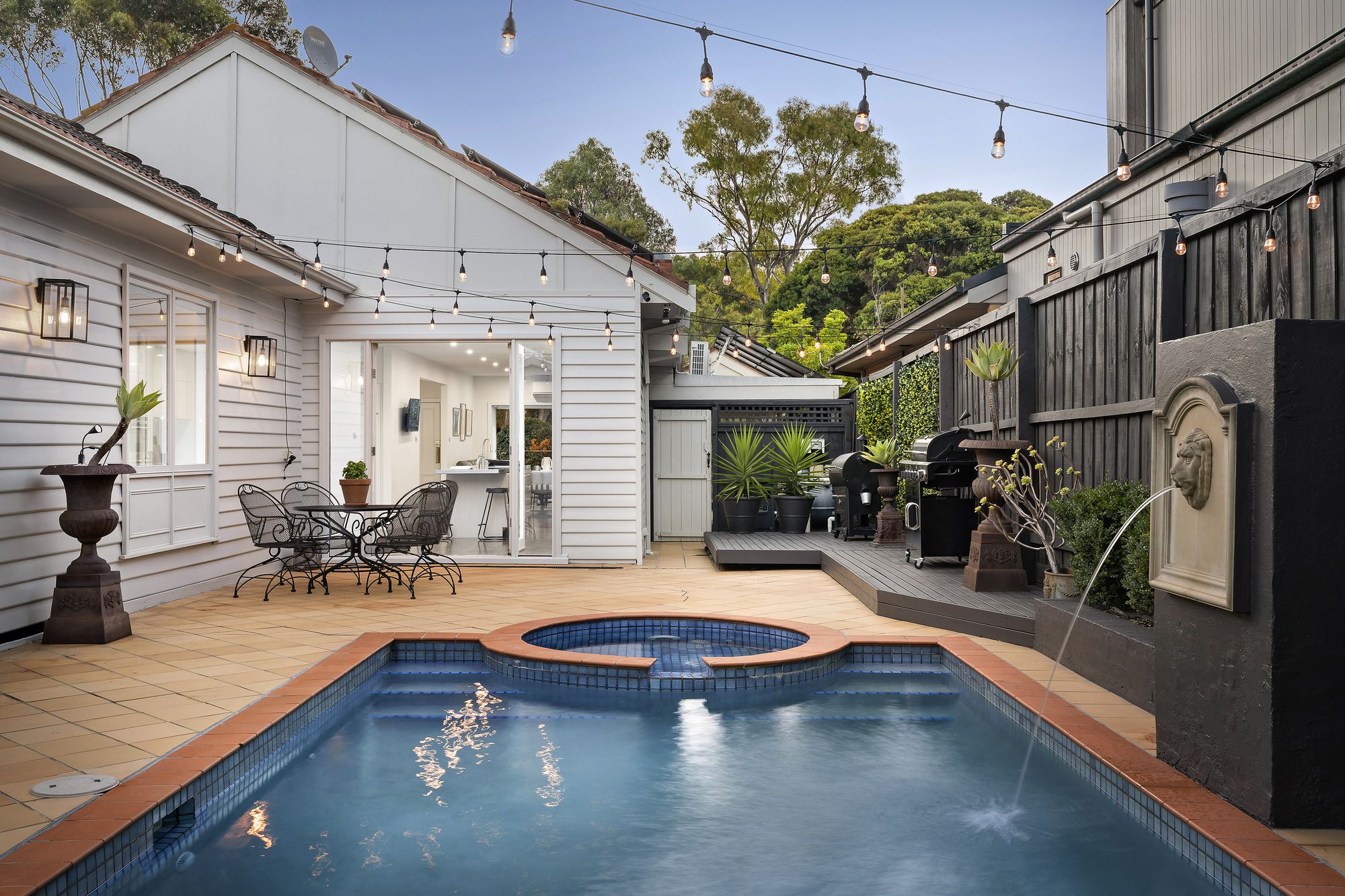 • Step out to the spectacular backyard offering a heated pool with a spa and an expansive, festoon-lit deck—ideal for entertaining and family enjoyment.