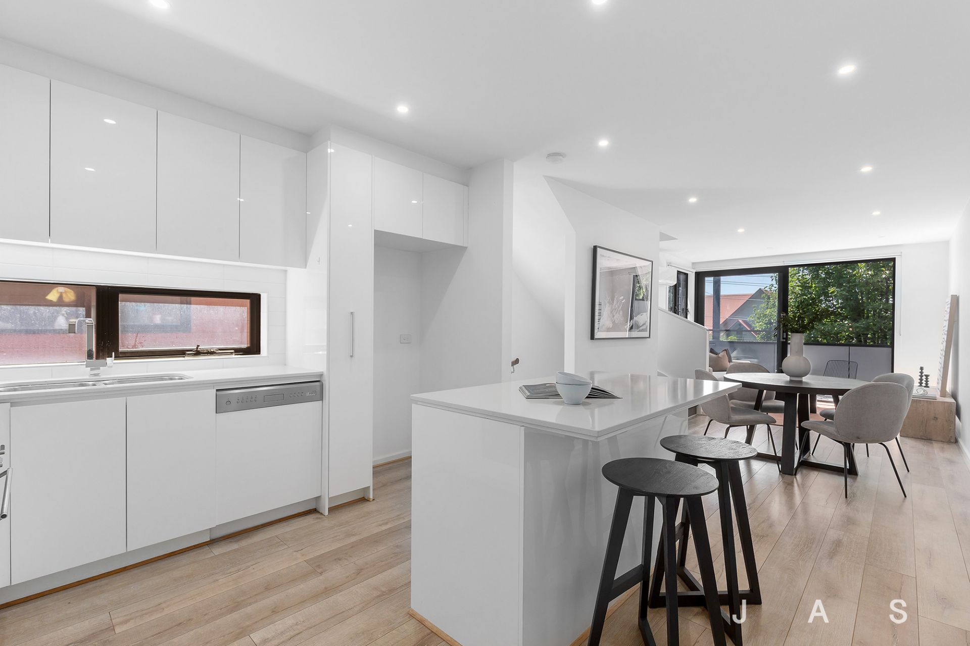 Sun-drenched open-plan living showcases spacious dining and living zones and a stone-topped kitchen, beautifully appointed with stainless steel cooking appliances, a semi-integrated dishwasher and a large island bench with breakfast bar.